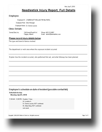 The Needlestick Injury report template is for the logging of sharps injuries, as described in our April, 2010 Newsletter, in the 'Practice Management Tips' section. This report gives full details of the persons involved in the needle incident. It also shows the employee's schedule on the day of the injury. See also the alternate report (ID: 4TM9 'Needlestick Injury Report, Confidential'), which is confidential and does not provide the names of the persons involved.